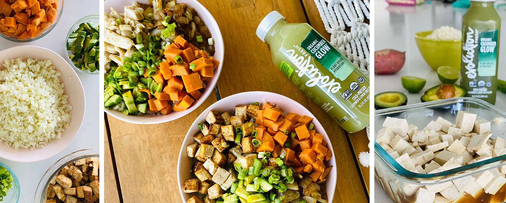 Time to decorate your bowl! I put the cauliflower rice on the bottom, and section out the tofu, sweet potato, onions, and avocado on top! Add chopped onion and extra marinade to top with more flavor.